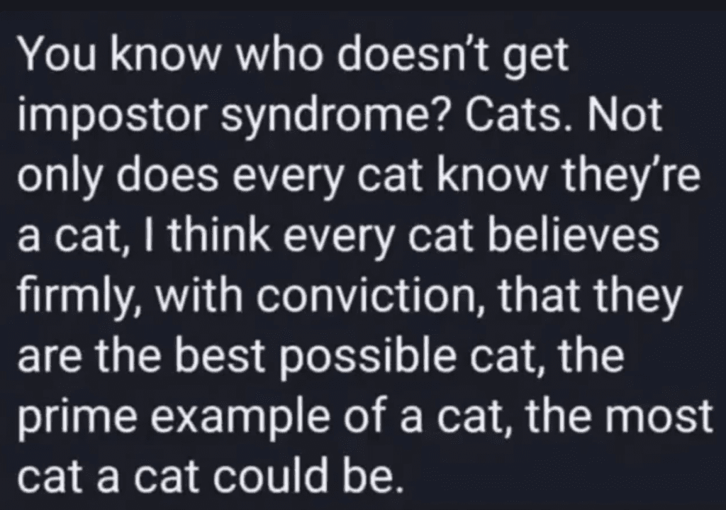 It’s funny, because it’s true! And the reason for this – as with all other things in the universe (that we know of) besides humans – is that cats don’t need to know themselves, because they are themselves. In every moment, without exception, fully embodied and living their authentic selves.